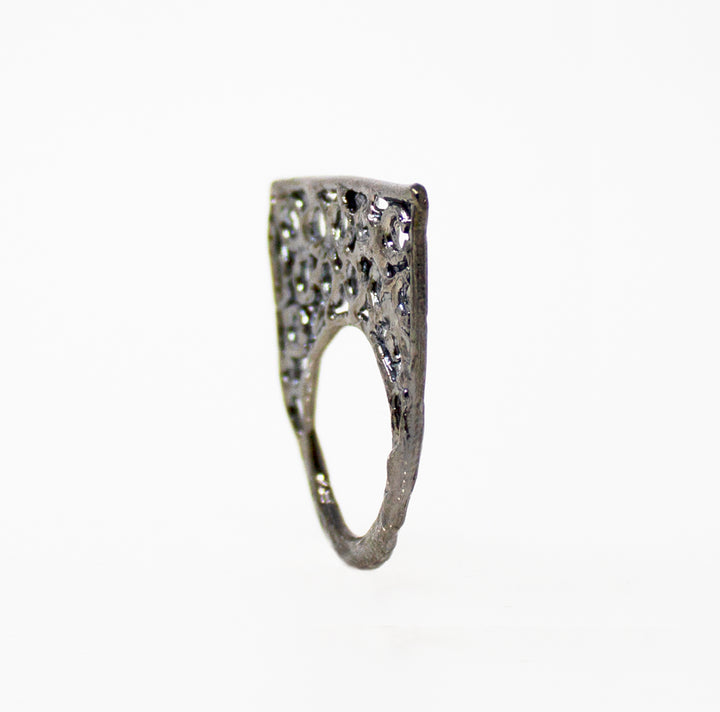 Anello piatto con tante piccole bollicine incastonate in una sagoma irregolare profilata in cera. Tre colori bronzo/ argento /argento rodiato nero … realizzabile anche in bronzo rosa