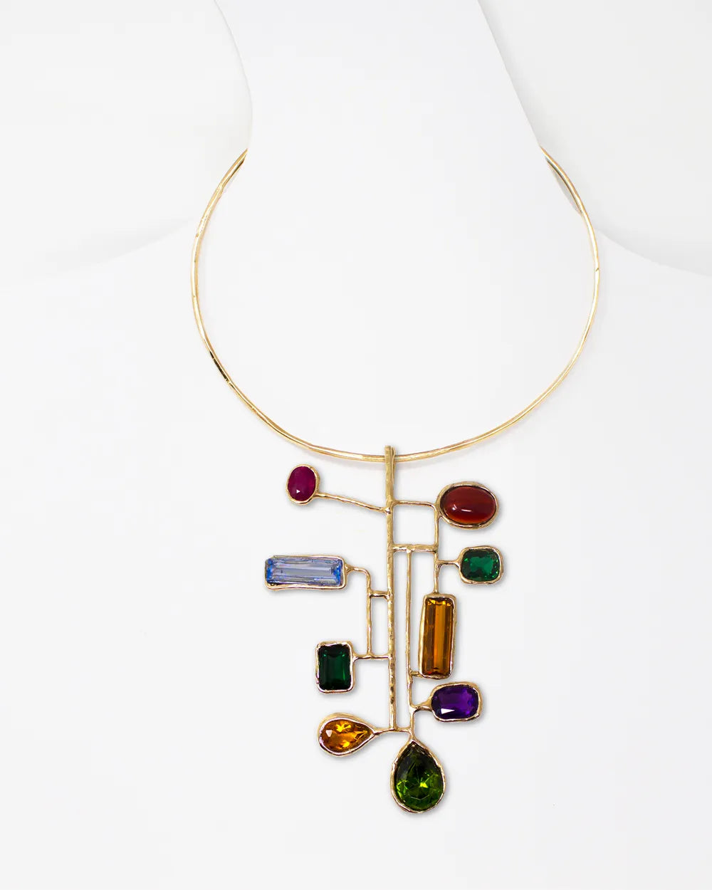 LA CERA si perde in mille colori per risplendere in questa cascata di pietre quando diventa BRONZO. Smeraldi di varie intensità topazi a goccia e taglio baguette, acquamarina taglio baguette e ametista sintetici, rubino naturale violaceo taglio rotondo.
